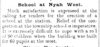 In 1896, the Nyah State School was established, with classes being first held in the town’s Top Hall. The school building was built in 1912. In 1915, the railway from Swan Hill was extended to the north, and it bypassed Nyah. As a result, Nyah West was developed. In 1915, the Nyah Railway Station School was opened. (Victorianplaces.com.au 2026) (Wikipedia 2024)
