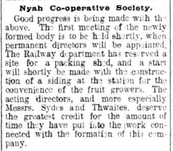 A fruit growers cooperative was also established, and during the 1920s, a packing shed was built at the railway siding. A hospital was also opened in the 1920s. In 1921, the population of Nyah West was 483, while the population of Nyah was 557. (Victorianplaces.com.au 2026)