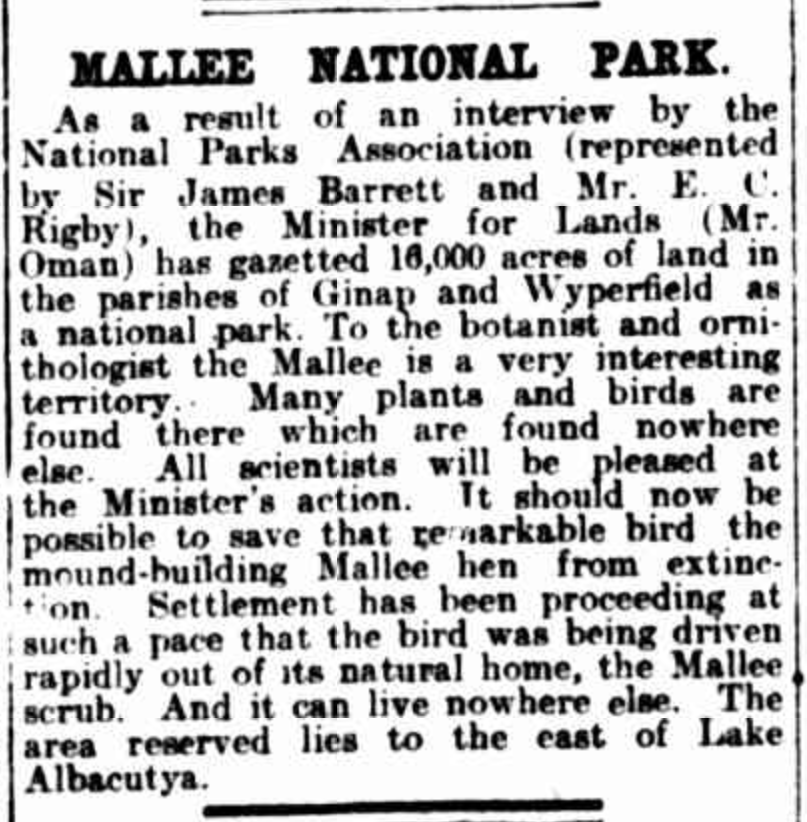 - Trove. (2026). MALLEE NATIONAL PARK – ITS HISTORY AND VALUE – The Argus (Melbourne, Vic. : 1848 – 1957) – 17 Nov 1934. [online] Available at: https://trove.nla.gov.au/newspaper/article/10994359 [Accessed 19 Apr. 2026].