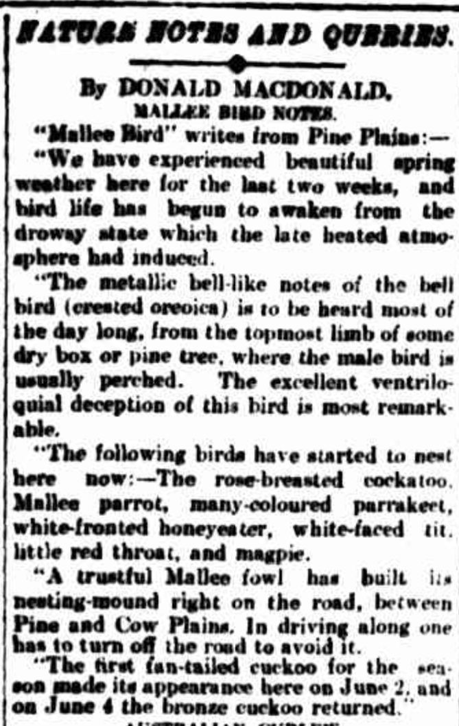 McLernnan became an acclaimed naturalist and bird watcher. Under the alias of ‘Mallee-Bird’, he wrote in the Nature Notes column of The Argus newspaper in Melbourne, Victoria. (Anbg.gov.au, 2020)