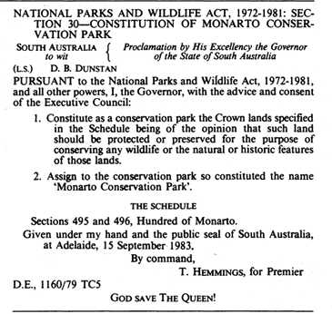 Above: Declaration of the park, SA Govt Gazette, 15 September 1983