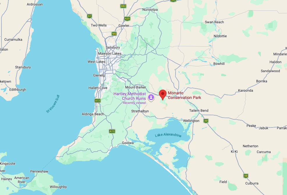 Above: Map showing the location of Monarto Conservation Park. Map c/o Google Maps