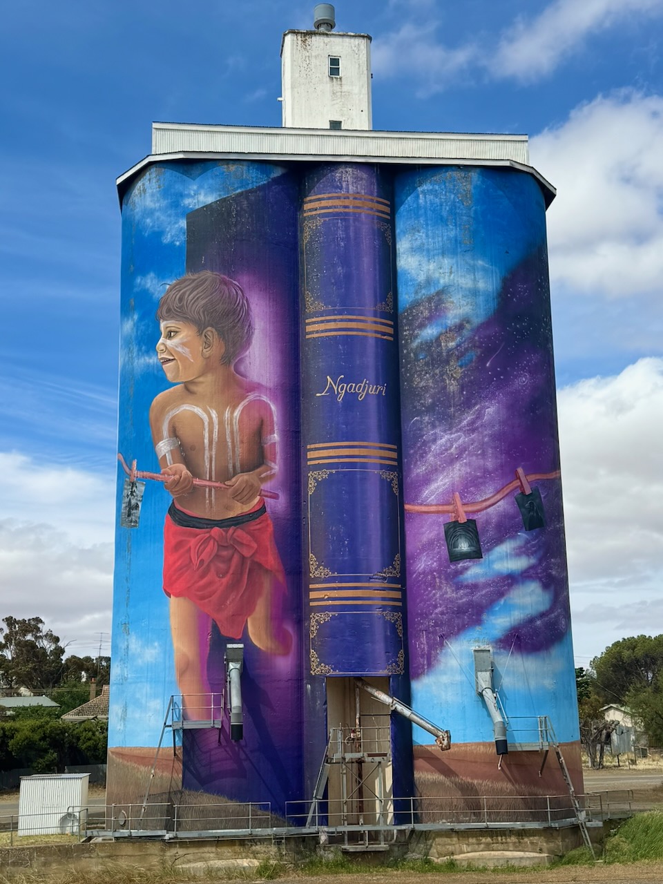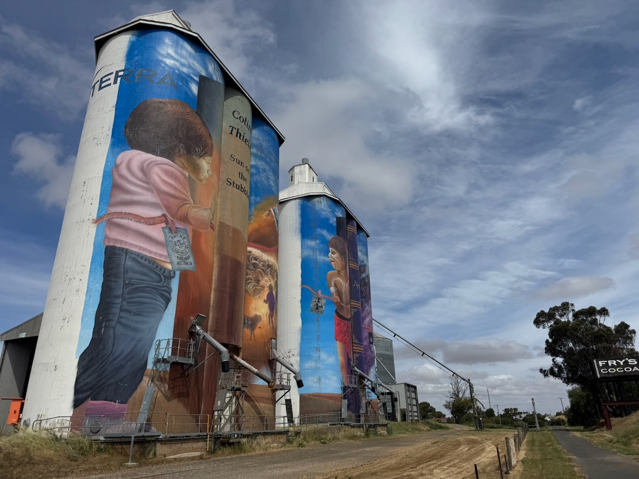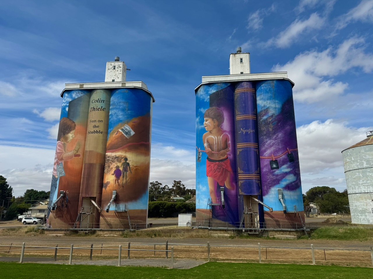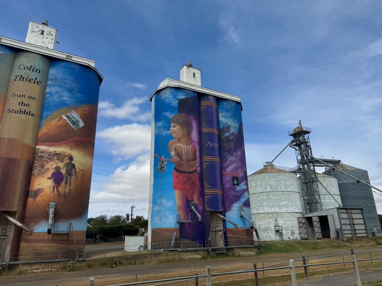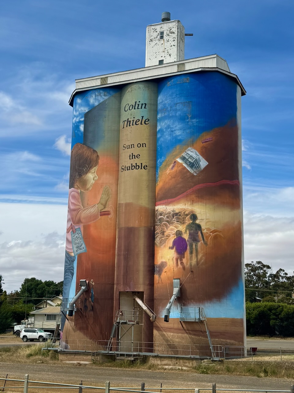 The Eudunda silos are part of the Australian Silo Art Trail. The art is the work of Sam Brooks and was completed in 2021. The artwork features two children and Colin Thiel’s novel, The Sun on the Stubble. (www.australiansiloarttrail.com, n.d.)
