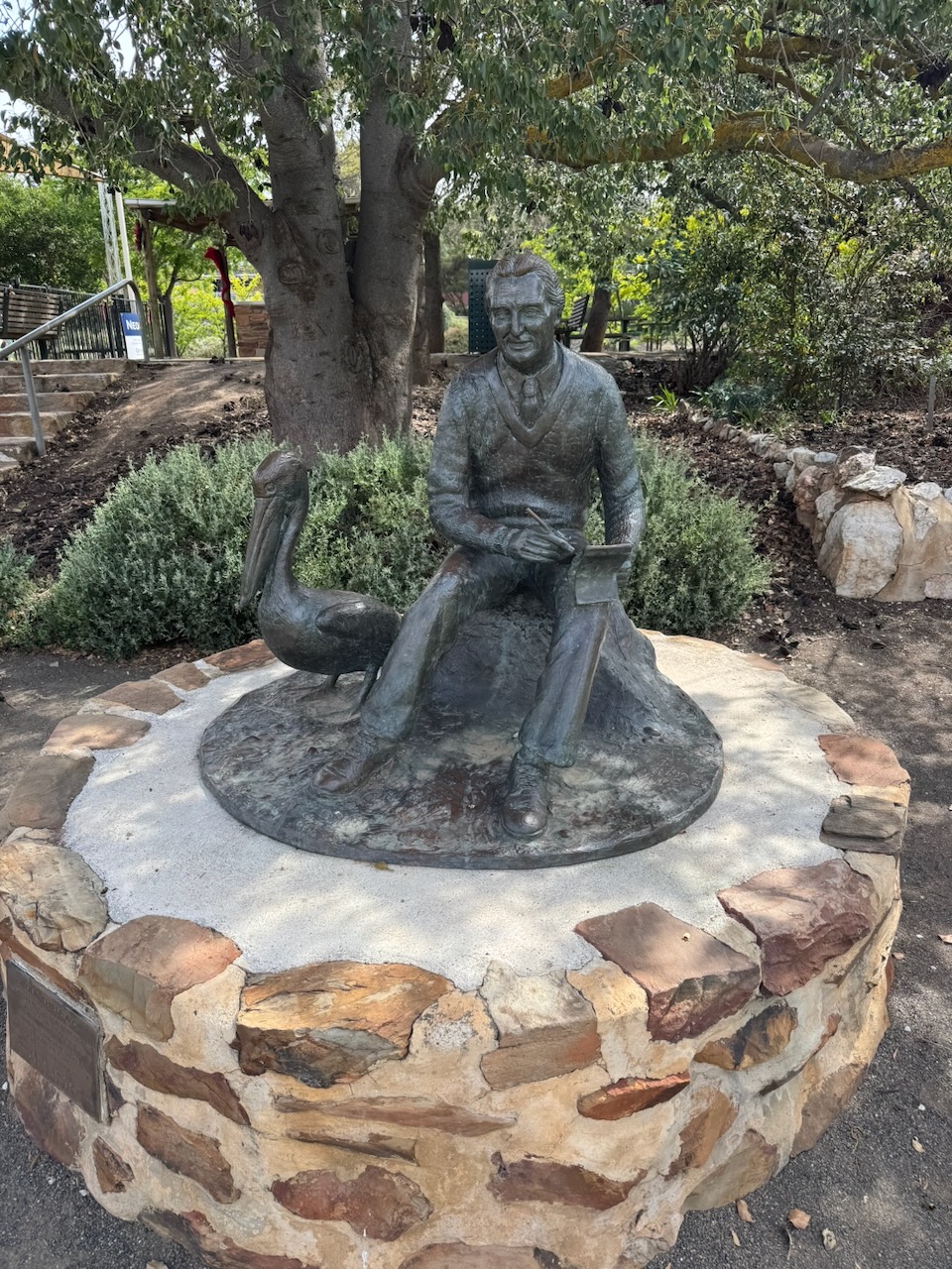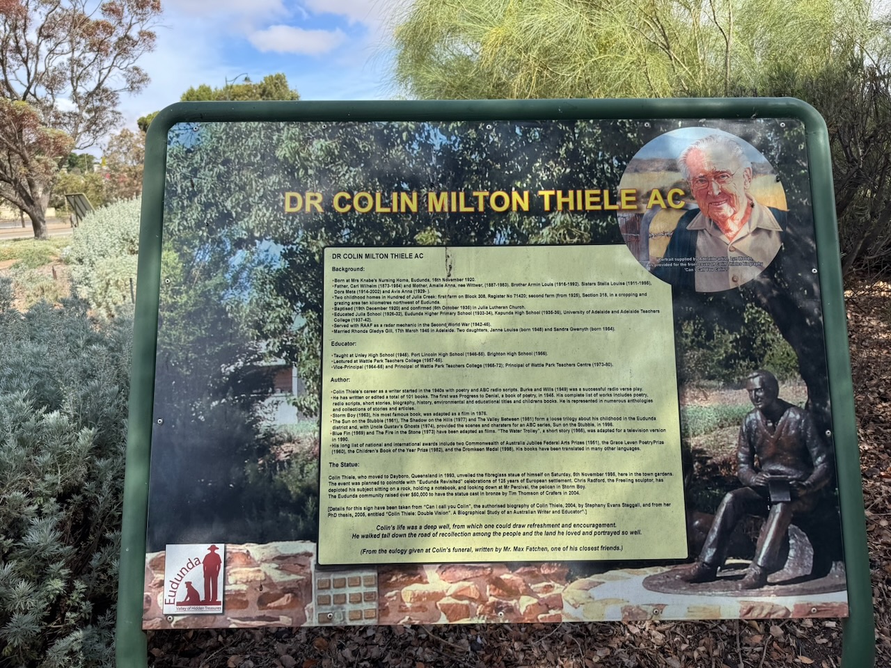 We visited the Eudunda Centenary Gardens at the corner of Worlds End Highway and Gunn Street. In the gardens is a statue of the Australian author Colin Thiele, who is well known for his works, including Storm Boy, Blue Fin and the Sun on the Stubble series. He was born at Eudunda in November 1920. (Wikipedia 2025) (Wikipedia 2026)