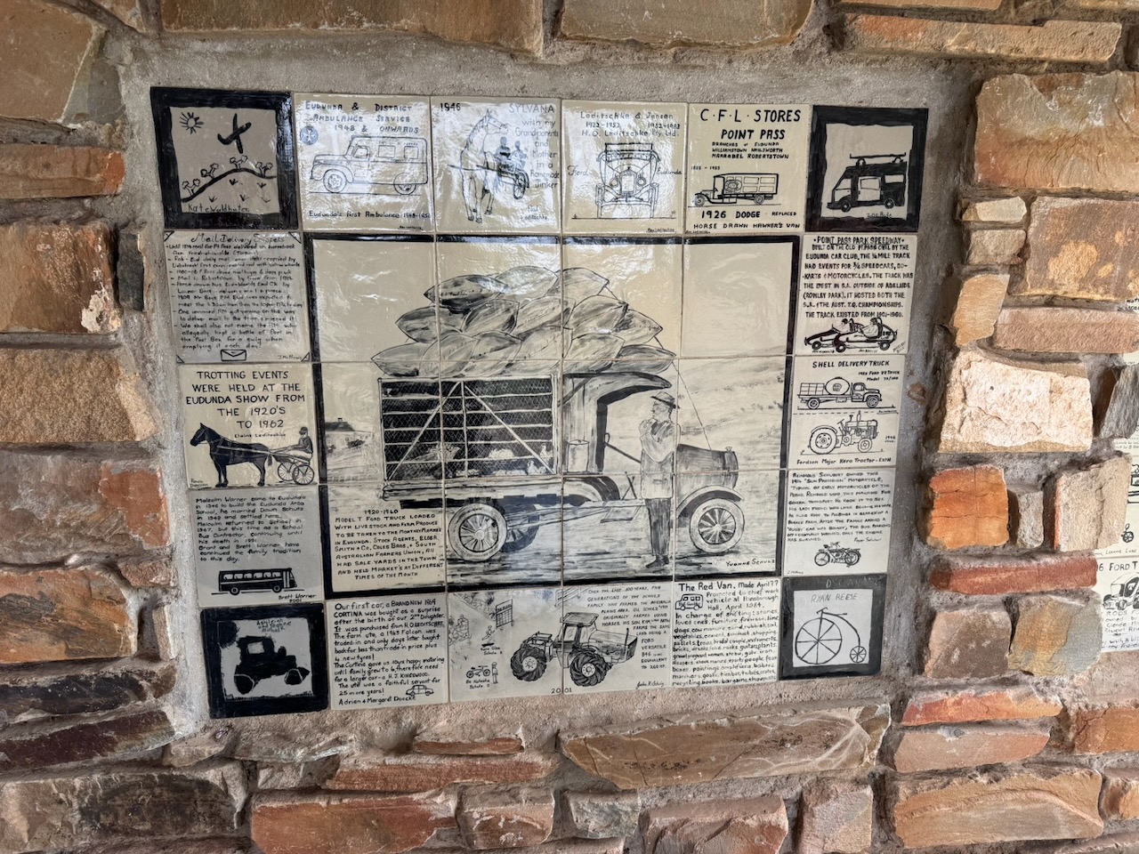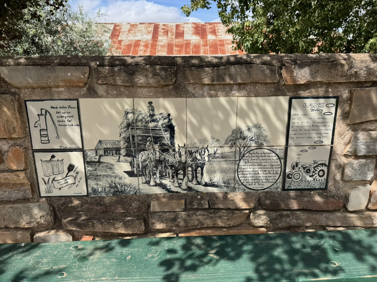 Another feature of the gardens is the shelter and walls with tiles that tell the story of Eudunda’s transport history.