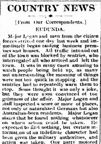 In February 1915, Major M.W. Logan from the 4th Military District and men from the Citizens’ Forces conducted raids on several homes and businesses of both German-born and Australian-born residents in Eudunda. The Citizens Forces was the name given at the time to what is now known as the Australian Army Reserve. Sentries were placed around Eudunda, and all travel in and out of the town was restricted. Nothing untoward was found, but it sent a message to all those in South Australia that the authorities were determined to suppress any disloyalty. (Torrensisland 2026) (Trove 2026) (Wikipedia 2020) (Wikipedia 2025)