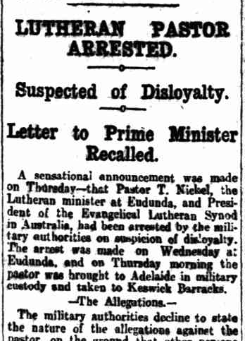 During WWI, there was significant anti-German sentiment in Australia. Eudunda had a significant German population and experienced a number of incidents. This included the arrest of Theodor Nickel, a Lutheran pastor in January 1915, who communicated with Hermann Homburg, the Attorney-General of South Australia, regarding naturalisation issues. He was accused of disloyalty. (Trove 2026) (Wikipedia 2025)