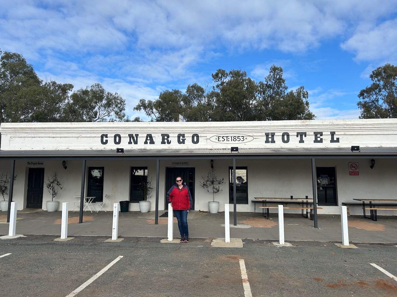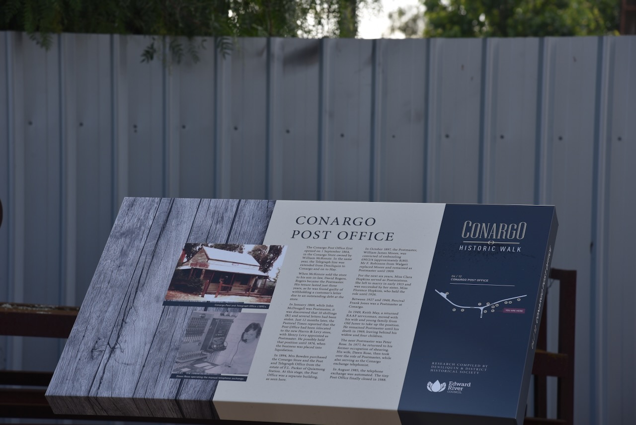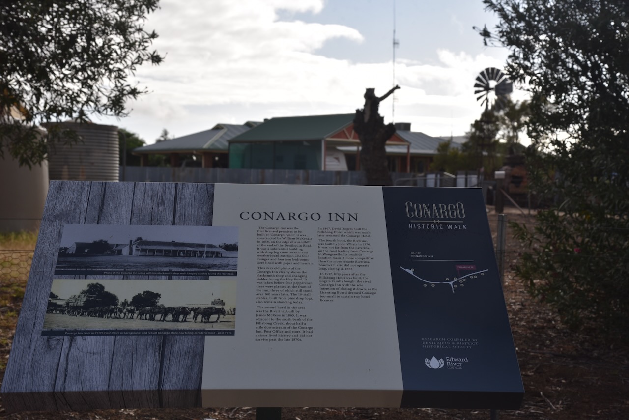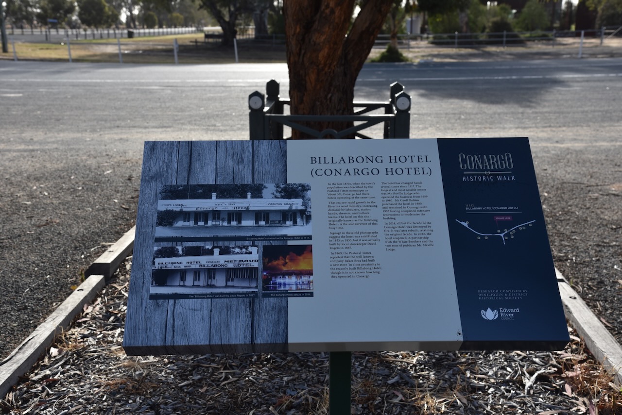 The Tocumwal Hotel is located on Deniliquin Street. It was closed for renovations during our visit to Tocumwal. The hotel was established in 1859 by Edward Hillson. It was originally a timber public house with an attached store. In 1868 it was destroyed by a fire. The hotel was rebuilt with the existing structure. In 1900 the hotel underwent significant renovation whilst Frank Staples was the licencee. In 1910 the hotel was sold. (Berrigan Shire 2025)