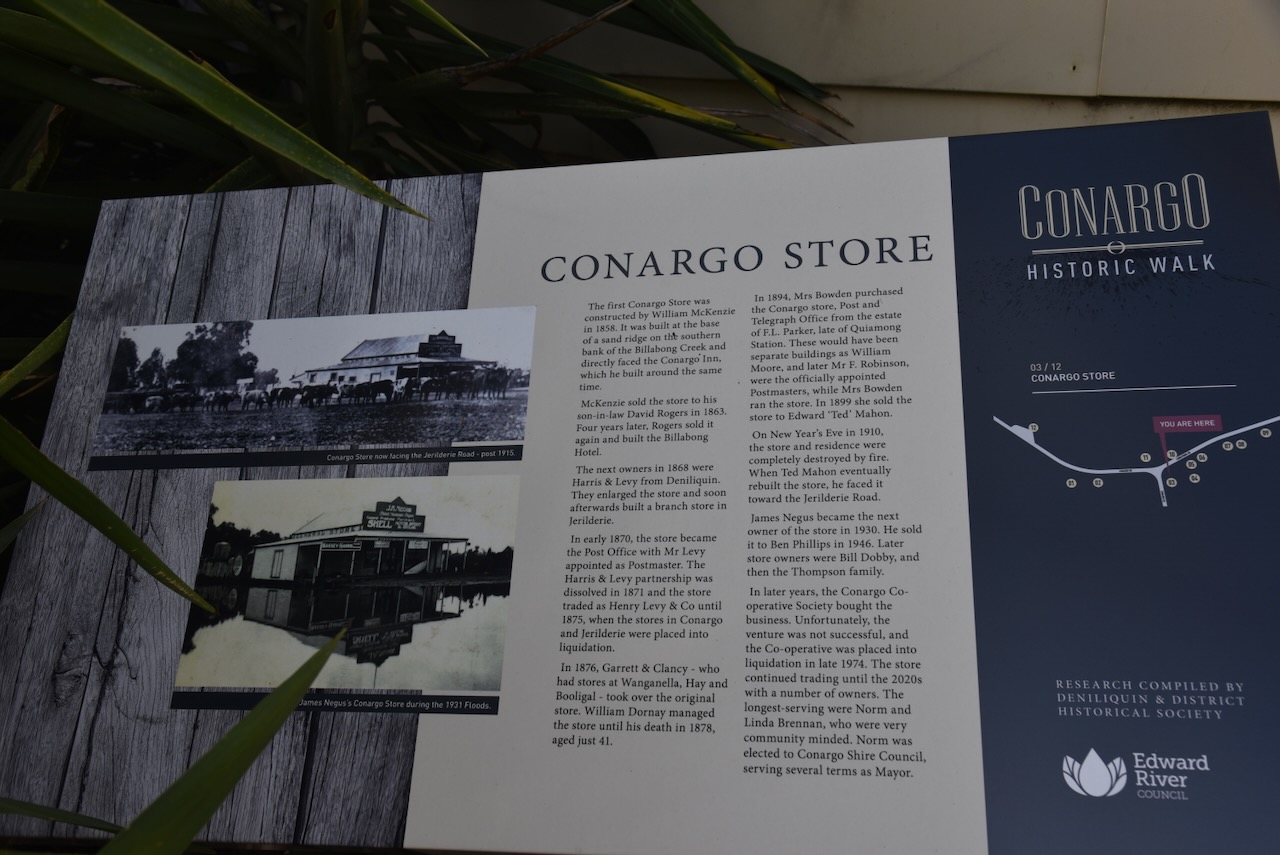 The store was built in 1900 for John Wilson and Robert Bustorff and traded as Bridge Stores. The partnership did not last long, and in November 1901, the partnership dissolved. Wilson became the sole owner, and as the business grew, the building was expanded. In February 1912, Wilson sold the business to Mr Cunningham, who continued to trade from the building, assisted by his wife. It was at this time that the business name was changed to Railway Stores. Two years later, in 1914, the store was sold to James Flanagan. The business was later sold to Laurence Plowright, who continued to run the store until the 1960s. (Berrigan Shire 2025) (Facebook 2026)