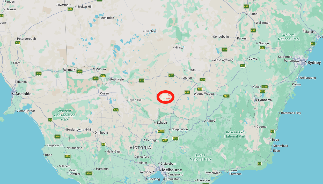 Tocumwal is about 275 km north of Melbourne and about 676 km southwest of Sydney. It is located in the southern Riverina region of New South Wales and lies on the northern bank of the Murray River. As of the 2021 Census, Tocumwal’s population was 2,862 people. (Wikipedia 2026)