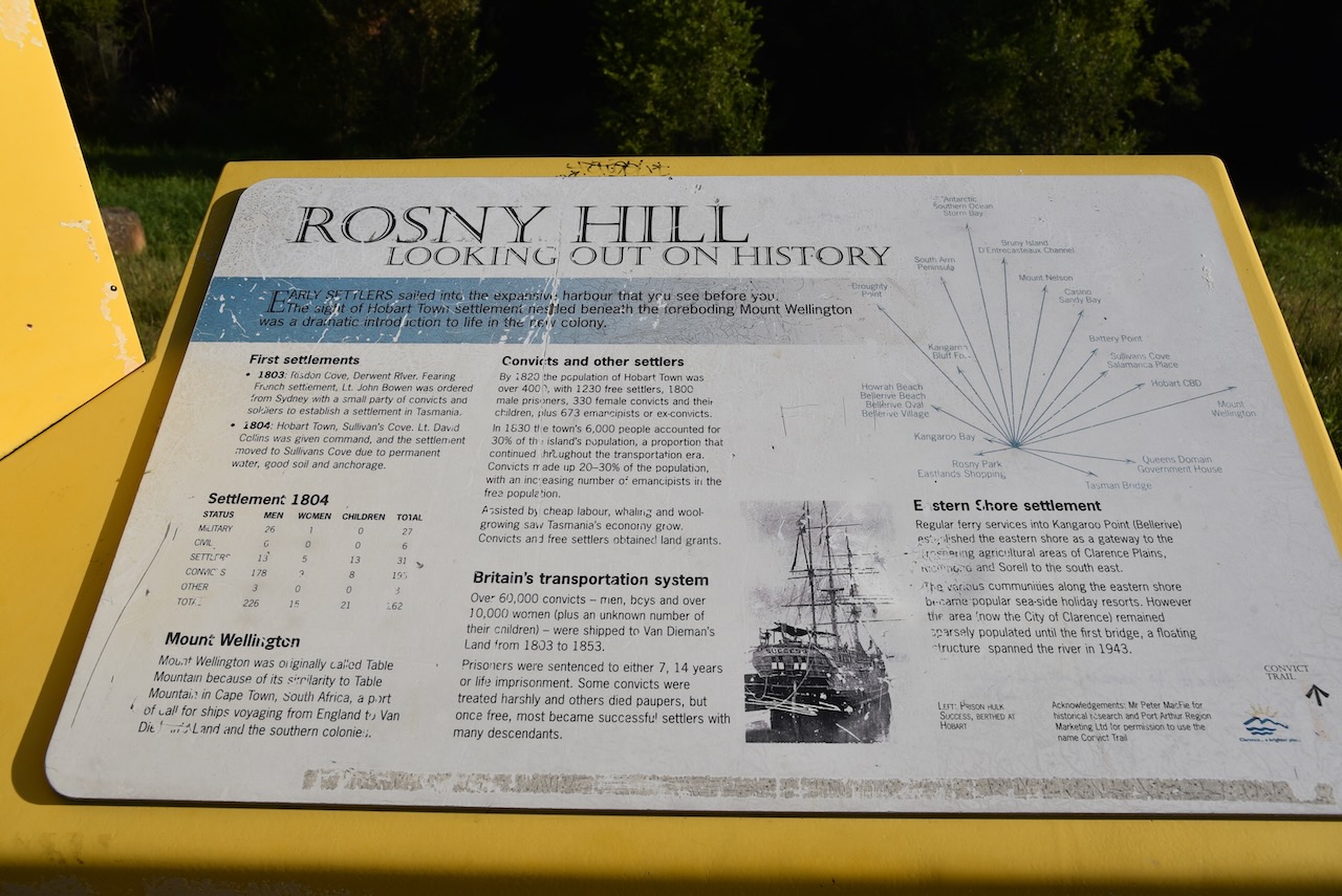 The park is within the original homelands of the Oyster Bay people who were once the largest tribe in Tasmania. The band most closely associated with Rosny Hill were the Moomairremener people.