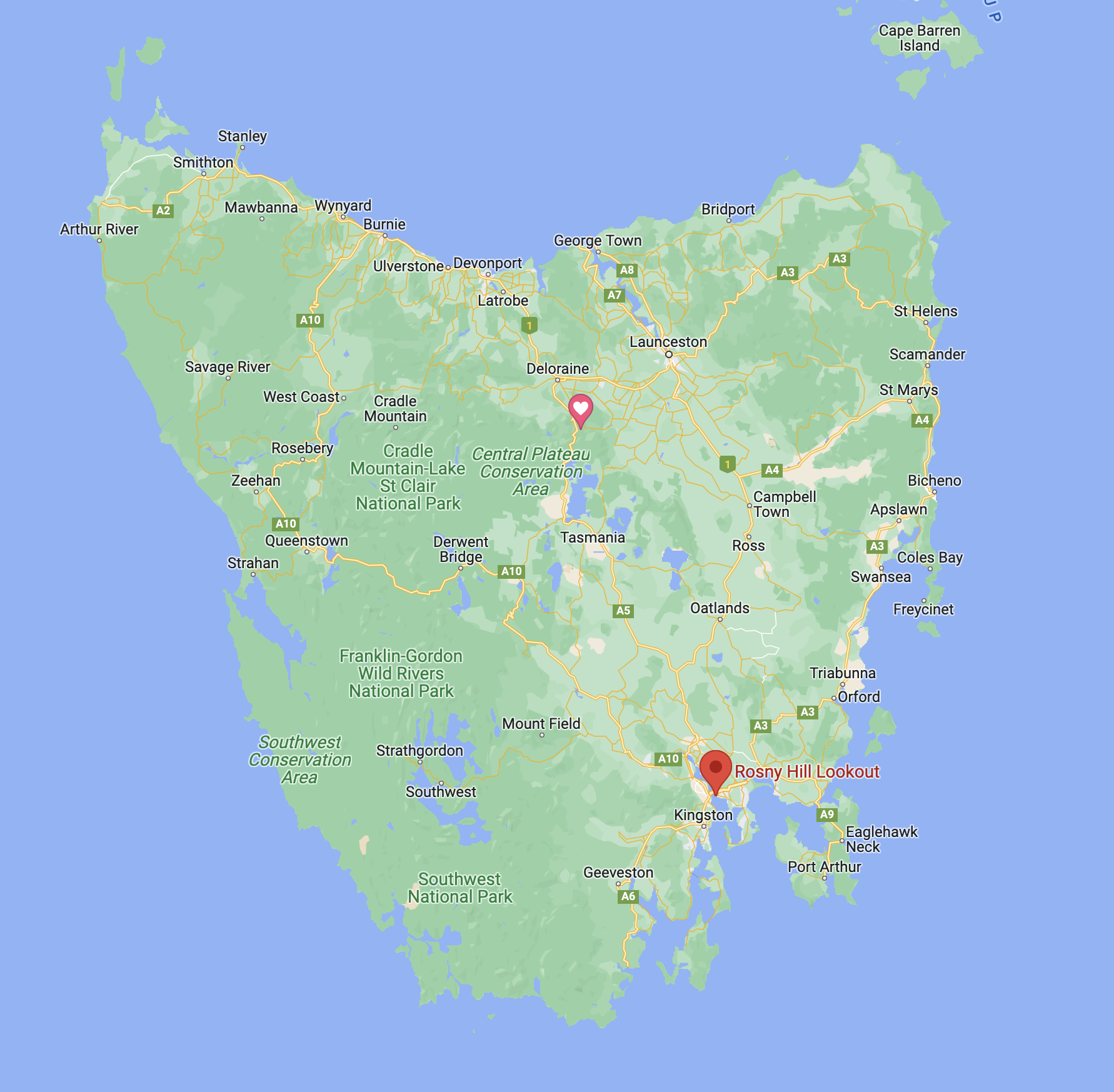 Above:- Map of Tasmania showing the location of the Mount Field National Park. Map c/o Google maps.