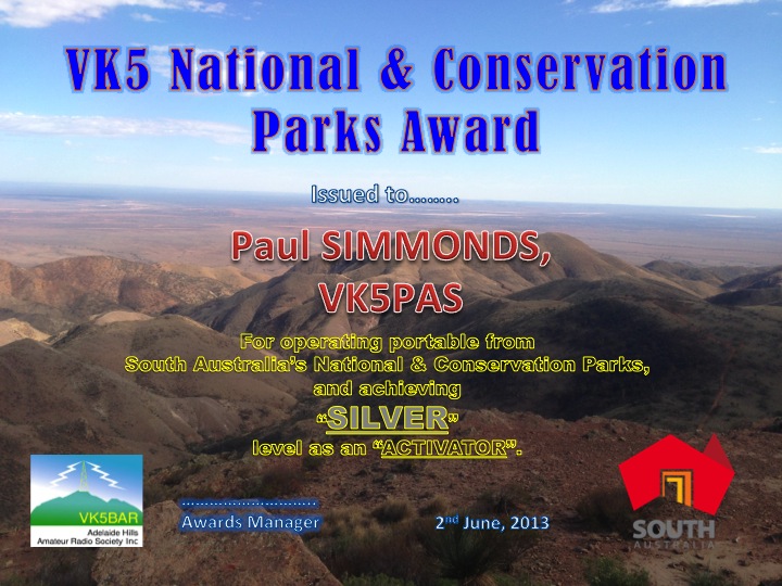 The aim of this Award is to encourage portable operation by amateur radio operators from within South Australia’s 21 National Parks (NP), and 262 Conservation Parks (CP), which are controlled by the Department of Environment, Water and Natural Resources (DEWNR).