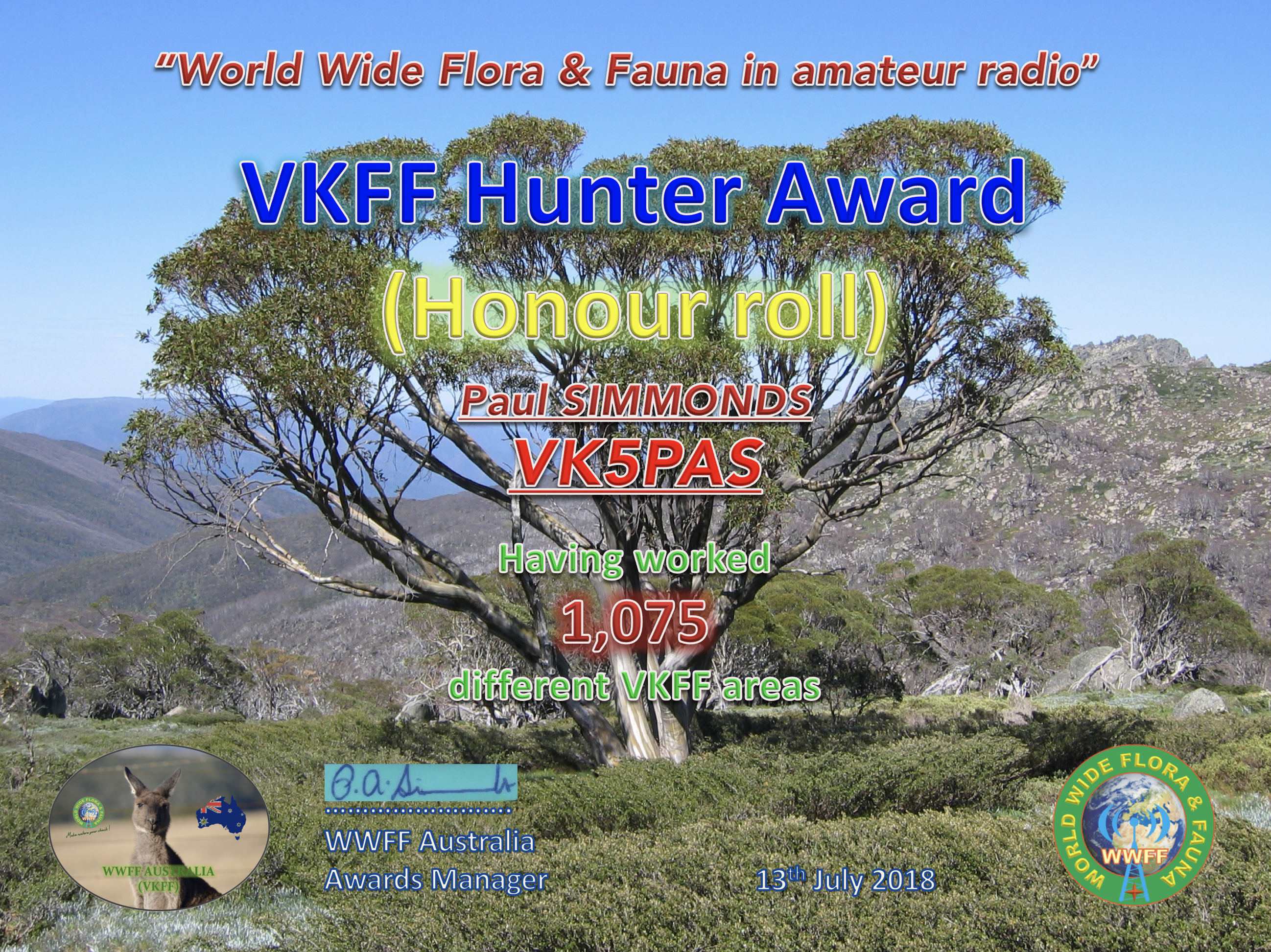 VK5PAS VKFF Hunter Honour Roll 1,075 Published August 2, 2018 at 2596 × 1945 in WWFF CERTIFICATES ← Previous Next → Like Loading...