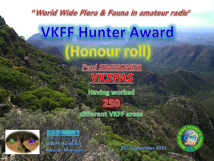 VK5PAS VKFF Hunter Honour Roll 250 Published July 25, 2016 at 720 × 540 in WWFF CERTIFICATES ← Previous Next → Honour Roll 250 Like Loading...