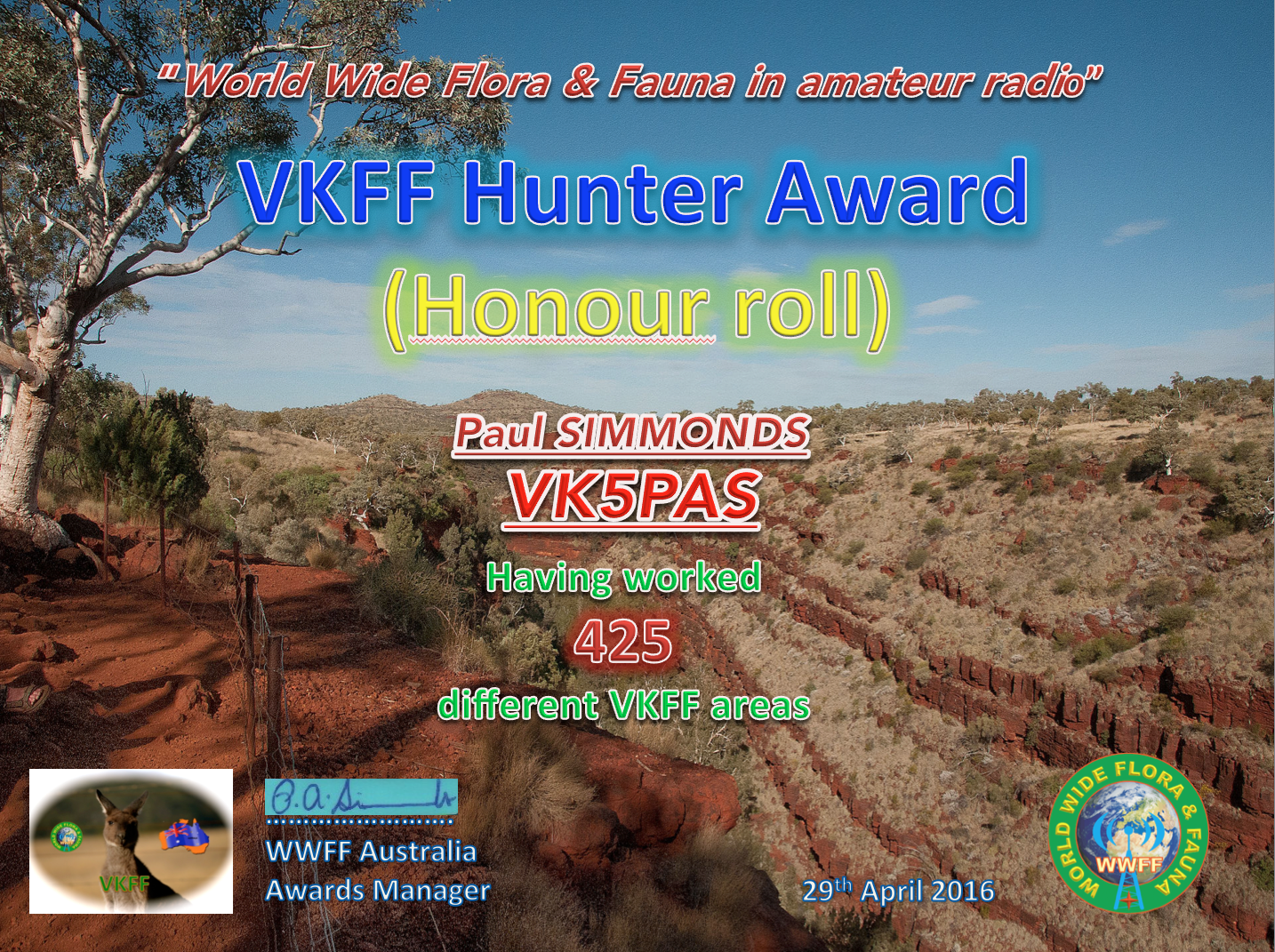VK5PAS VKFF Hunter Honour Roll 425 Published August 2, 2018 at 1434 × 1071 in WWFF CERTIFICATES ← Previous Next → Like Loading...