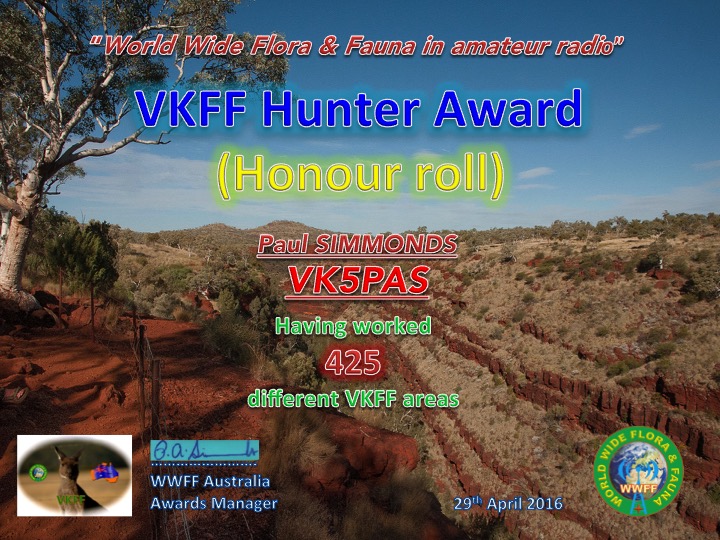 VK5PAS VKFF Hunter Honour Roll 425 Published July 25, 2016 at 720 × 540 in WWFF CERTIFICATES ← Previous Next → Honour Roll 425 Like Loading...