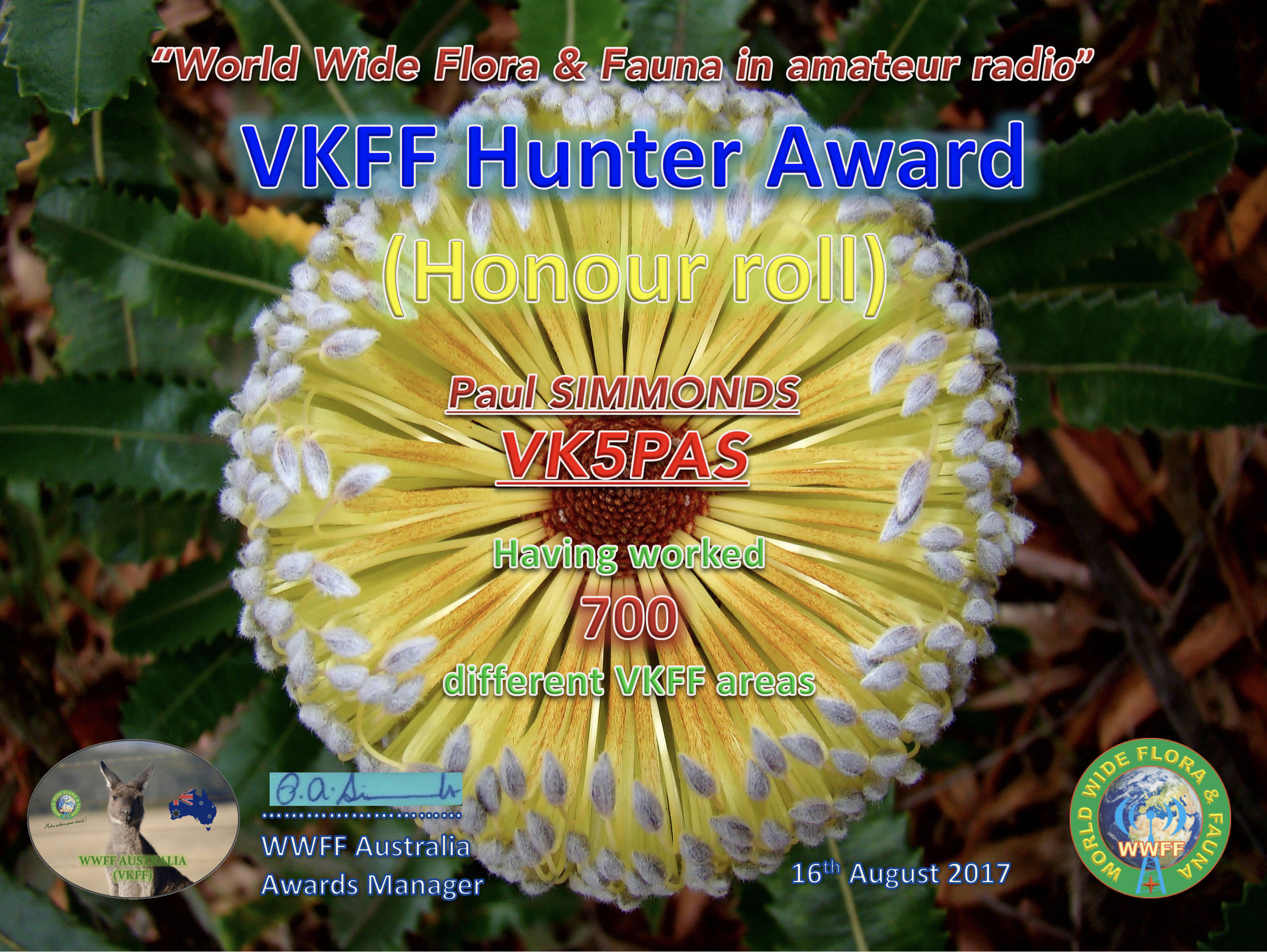 VK5PAS VKFF Hunter Honour Roll 700 Published August 21, 2017 at 2575 × 1935 in WWFF CERTIFICATES ← Previous Next → Honour Roll 700 Like Loading...