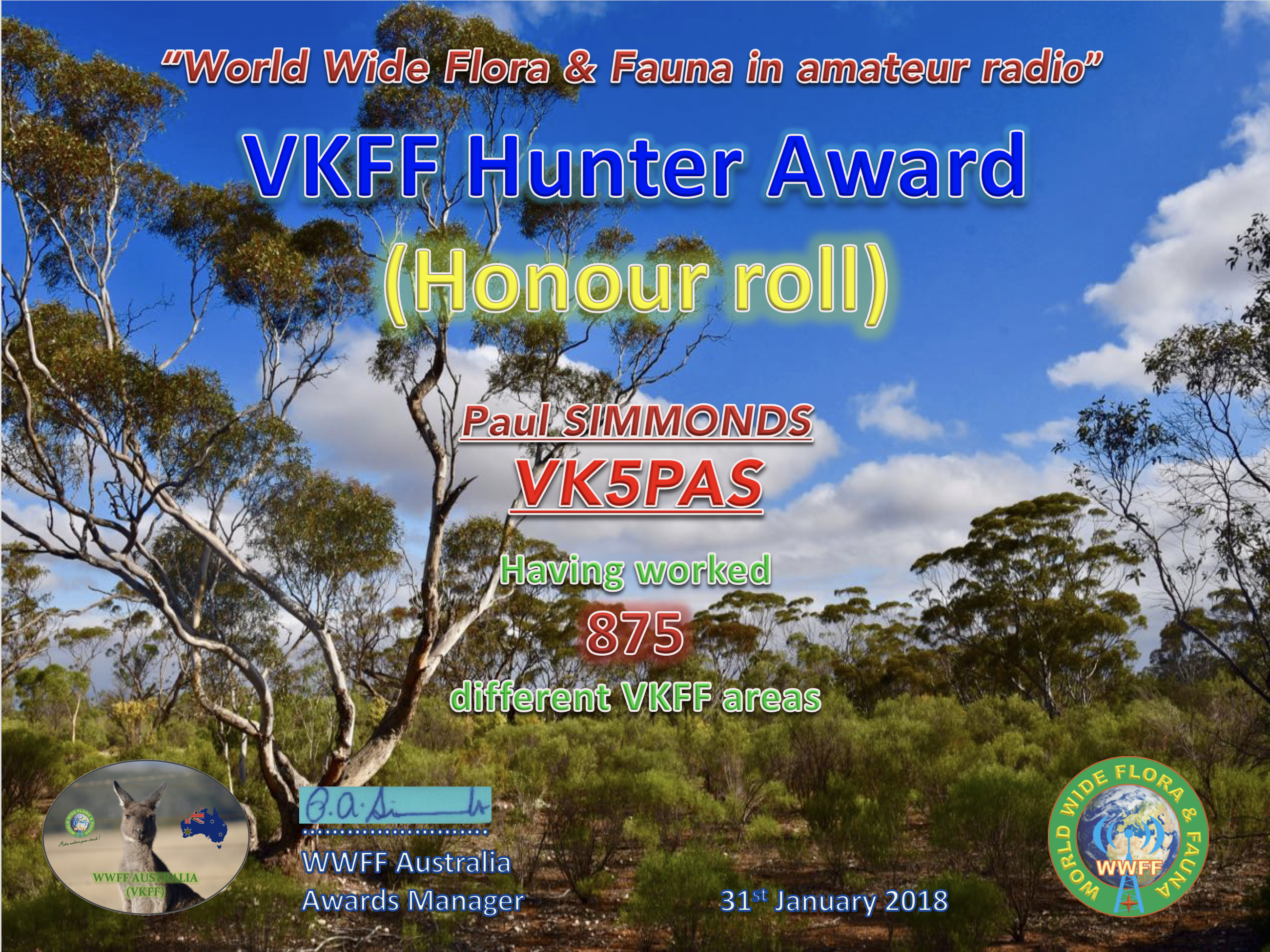 VK5PAS VKFF Hunter Honour Roll 875 Published September 28, 2018 at 2602 × 1950 in WWFF CERTIFICATES ← Previous Next → VKFF Hunter Honour Roll 875 Like Loading...